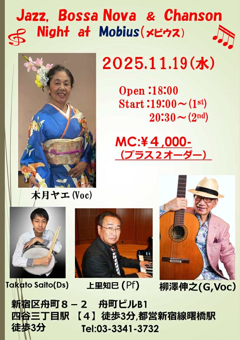 Jazz Bossa Nova & Chanson Night at Mobius 開催日2025/11/19(水曜日) オープン18:00 スタート19:00 出演者木月 ヤエ(voc) Takato Saito(Ds) 上里 知巳(Pf)柳澤伸之(G,Voc) チャージ料4000円(税別)