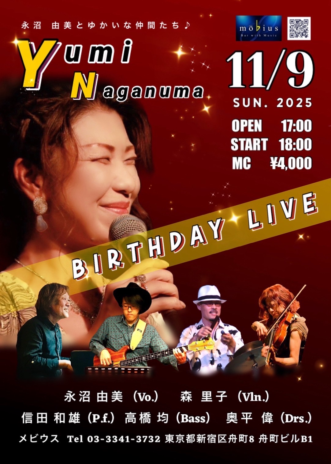Yumi Naganuma BIRTHDAY LIVE 開催日2025/11/09(日曜日) オープン18:00 スタート19:00 出演者永沼 由美(vo) 森 里子(vln) 信田 和雄(pf) 高橋 均(ba) 奥平 偉(drs) チャージ料4000円(税別)