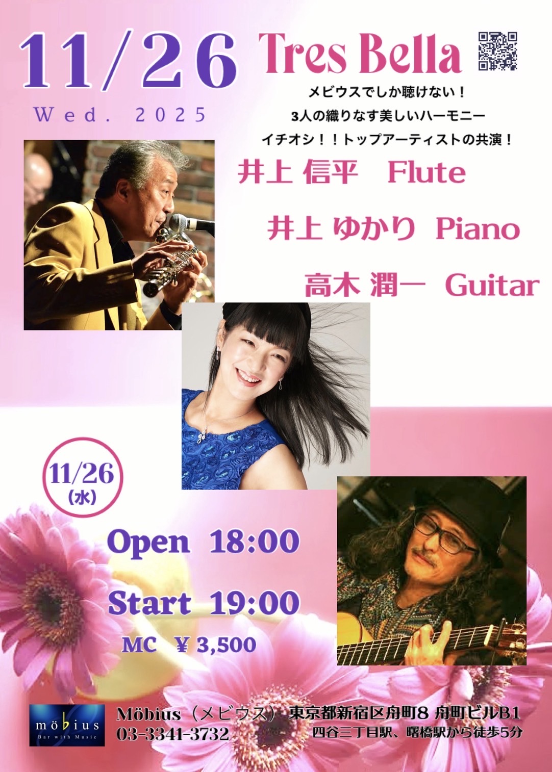 スーパートリオLIVE 「Tres Bella 」 開催日2025/11/26(水曜日) オープン18:00 スタート19:00 出演者井上信平(Fl) 高木潤一(G) 井上ゆかり(Pf) チャージ料 MC 3,500円(税別)