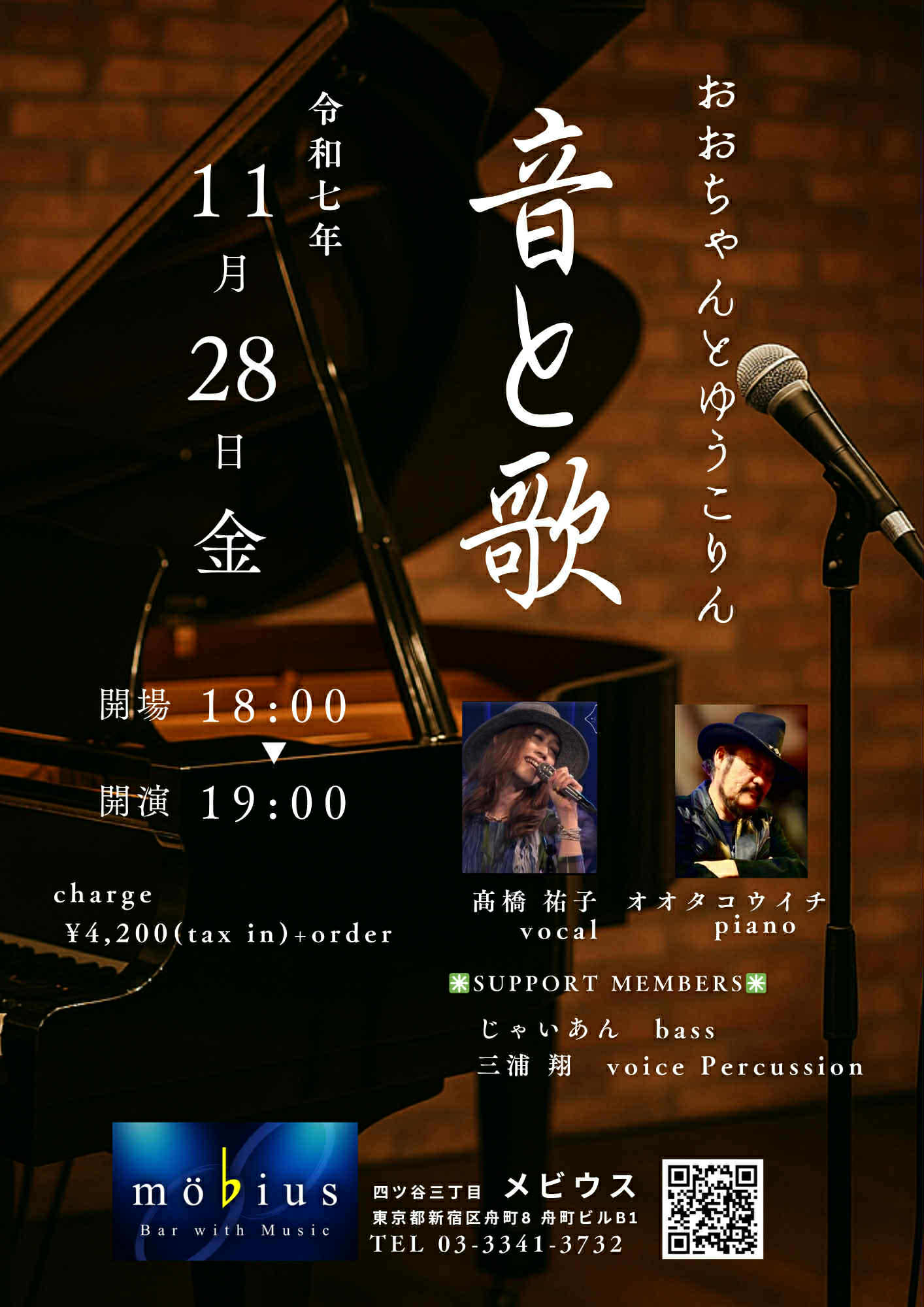 おおちゃん と ゆうこりん 「音と歌」 開催日2025/11/28(金曜日) オープン18:00 スタート19:00 出演者高橋 祐子(Vo) オオタコウイチ(Pf) Support じゃいあん(B) 三浦 翔(VPer) チャージ料4200円(税込)