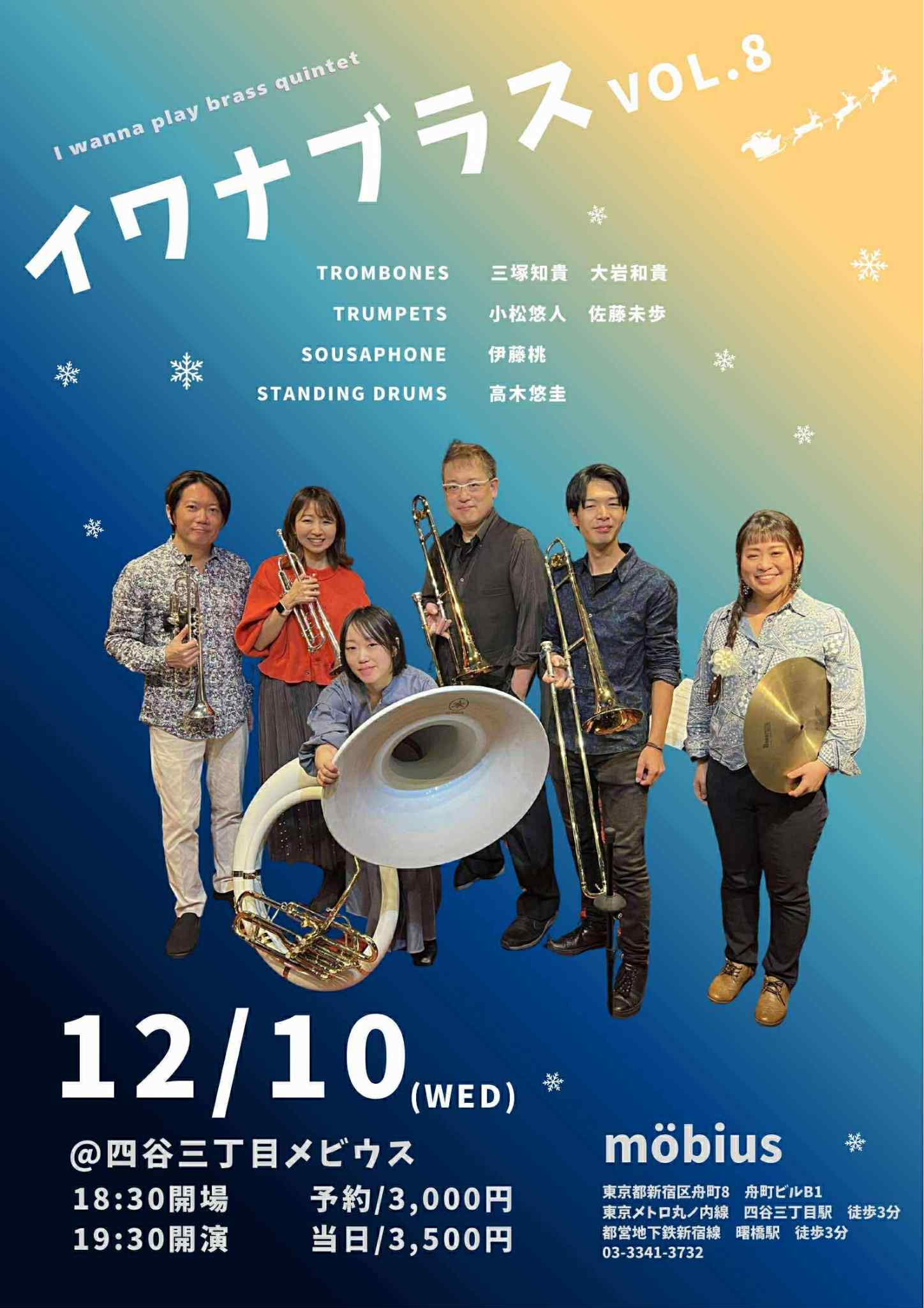 イワナブラス VOL.8 開催日2025/12/10(水曜日) オープン18:30 スタート19:30 出演者Trombones 三塚知貴 大岩和貴 Trumpets 小松悠人 佐藤未歩 Sousaphone 伊藤桃 Drums高木悠圭 チャージ料約3000 円 当日3500 円(税別)