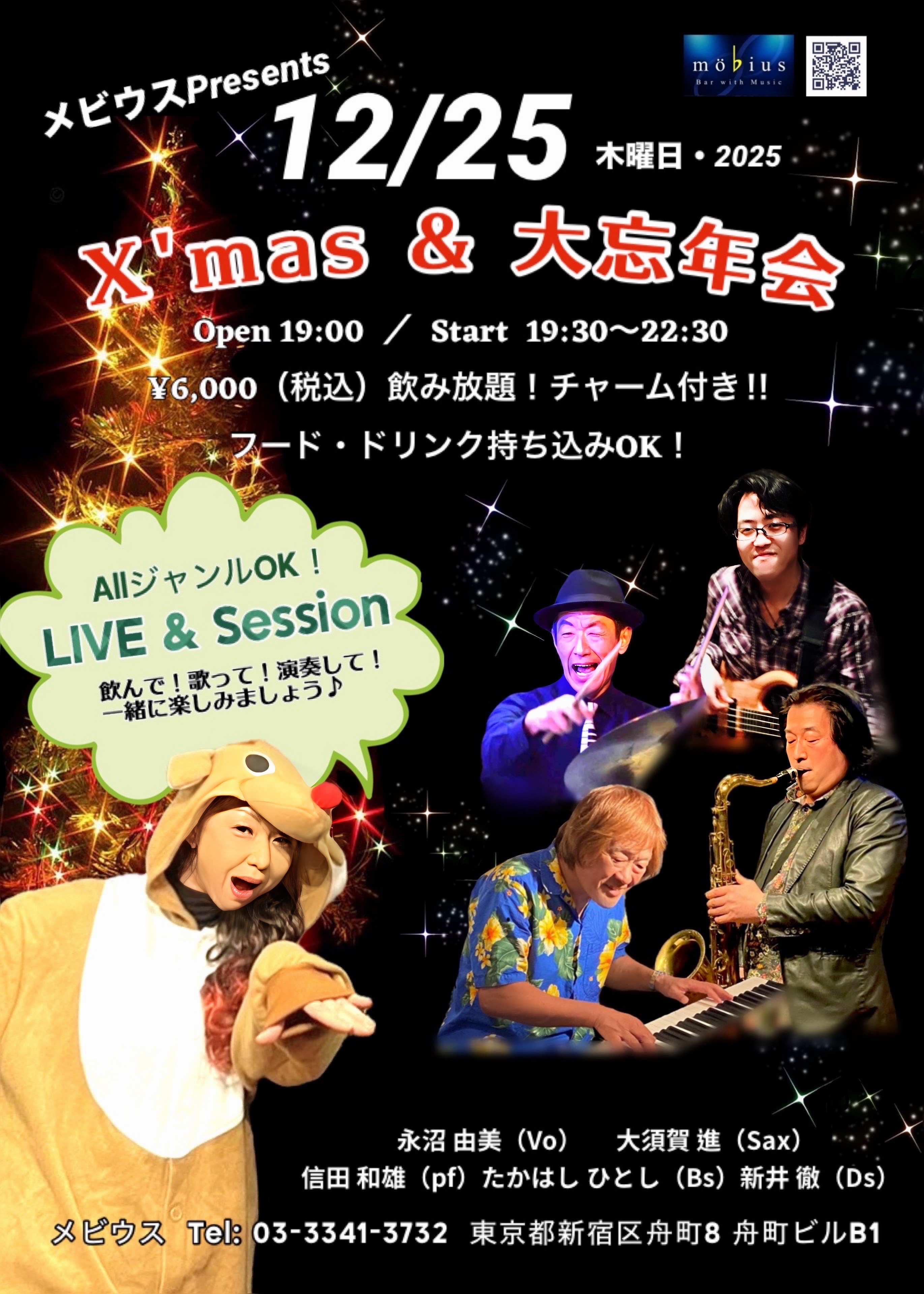 出演者永沼由美、vo 大須賀 進,sax 信田和雄,pf たかはしひとし,ba 新井徹,dr