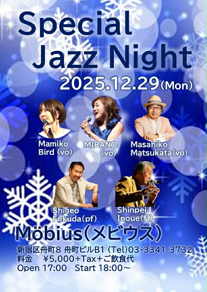 Special Jazz Night 開催日2025/12/29(月曜日) オープン17:00 スタート18:00 出演者MIRANO(vo) 井上信平(fl ) 福田重男(pf)Mamiko Bird(vo) Masahiko Matsukata(vo) チャージ料5000円(税別)