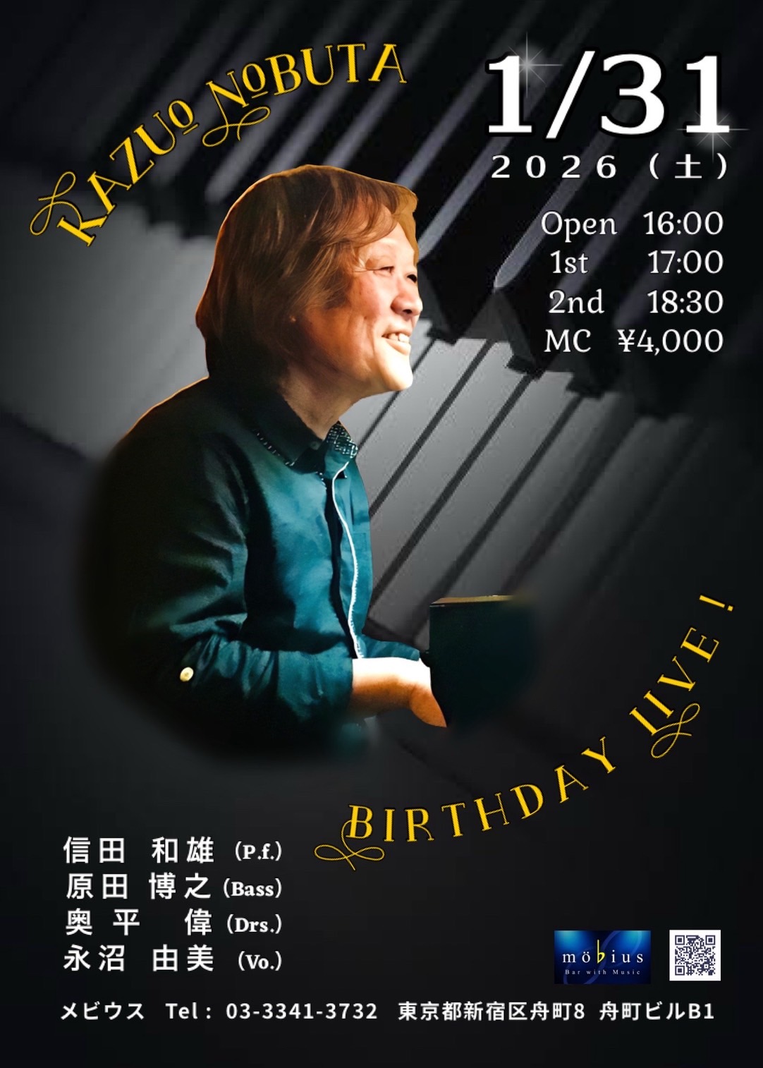 KAZUO NOBUTA 「BIRTHDAY LIVE」 開催日2026/01/31(土曜日) オープン16:00 スタート17:00 出演者信田 和雄(pf) 永沼 由美(vo) 奥平 偉(Drs) 原田 博之(Ba) チャージ料4000円(税別)