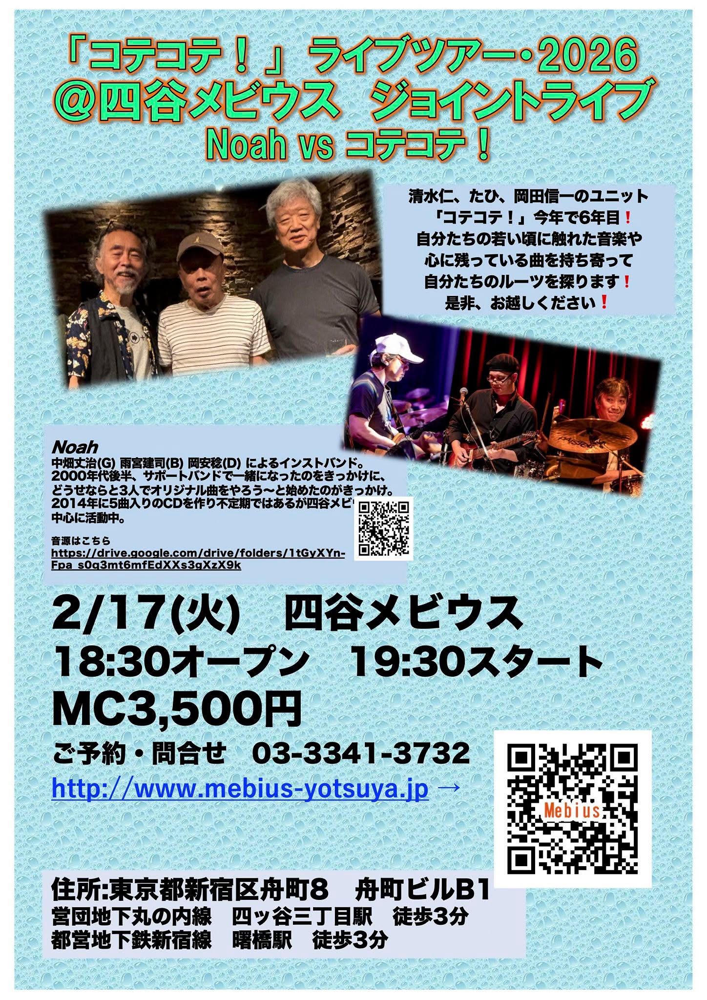 「コテコテ!」ライブツアー・2026@四谷メビウス ジョイントライブ Noah vs コテコテ! 開催日2026/02/17(火曜日) オープン18:30 スタート19:30 出演者Noah vs コテコテ! チャージ料 MC 3,500円(税別)