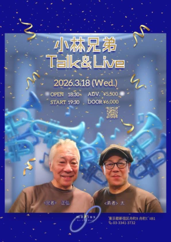 出演者小林 兄弟  Talk & Live  OPEN 18:30  START 19:30   出演  兄 小林正弘   弟 小林太     MC  Ad 5500円 Dr 6000円 (税別) お休み