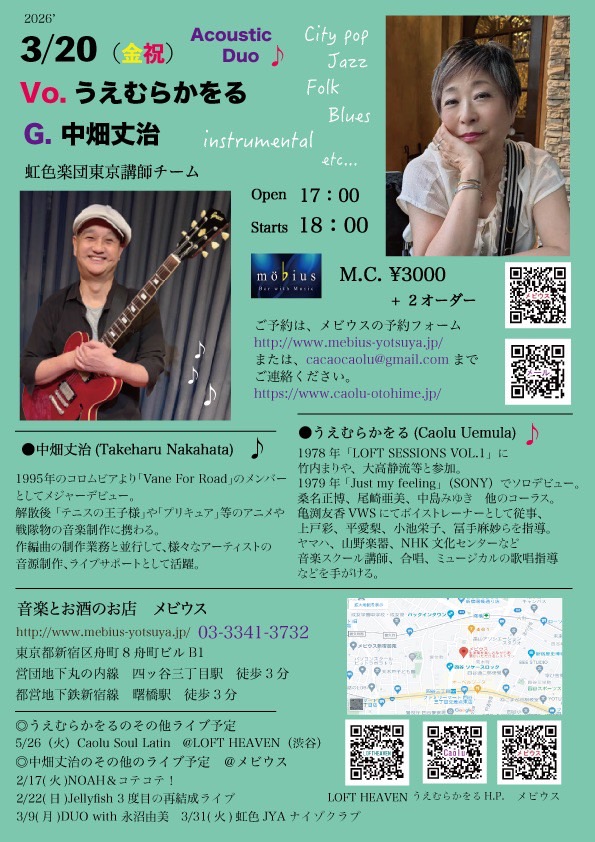 アコースッティック デュオ(虹色楽団講師チーム) 開催日2026/03/20(金曜日) オープン17:00 スタート18:00 出演者うえむら かをる(vo) 中畑 丈治(gt) チャージ料 MC 3,000円(税別)