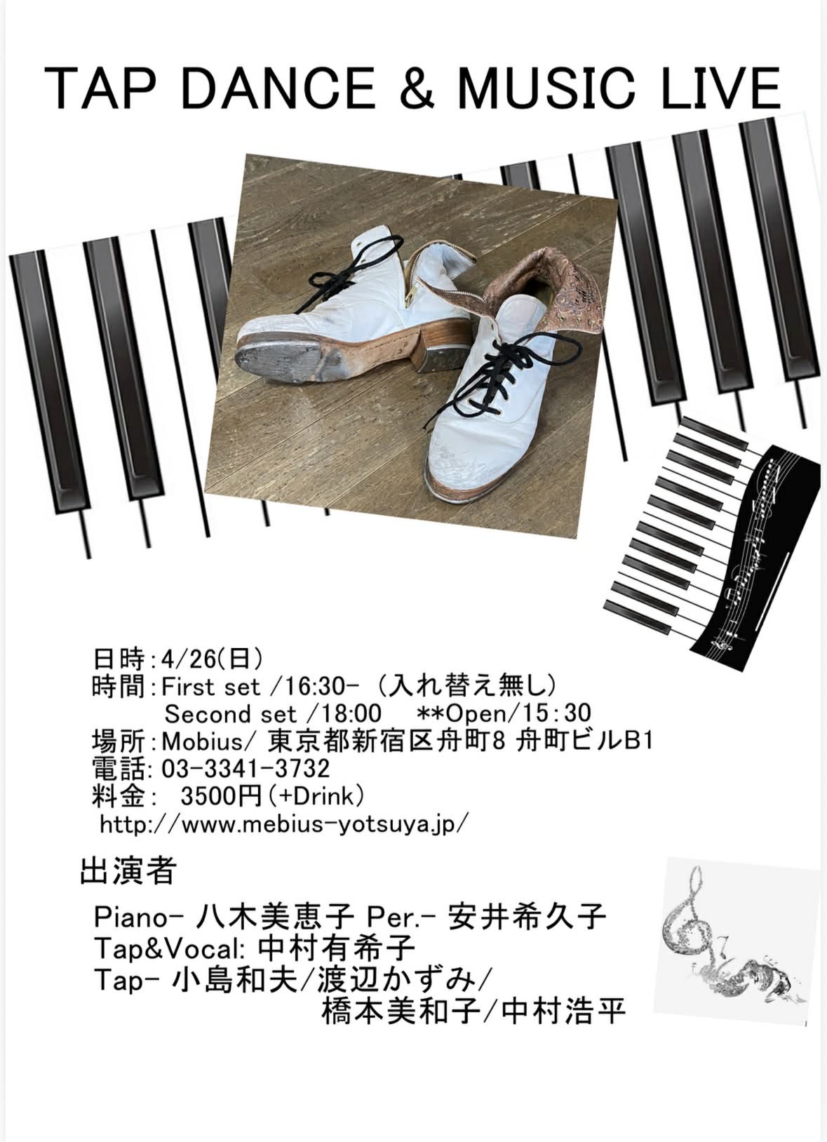 TAP DANCE & MUSIC LIVE 開催日2026/04/26(日曜日) オープン15:30 スタート16:30 出演者 Pf 八木 美恵子 Per. 安井 希久子 Tap&Vo 中村 有希子 Dancer 橋本 美和子 小島和夫 渡辺 かずみ 中村 浩平 チャージ料 MC 3,500円(税別)