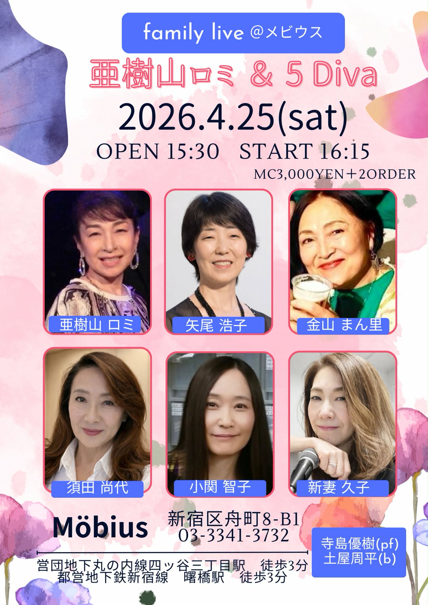 亜樹山 ロミ & 5Diva 開催日2026/04/25(土曜日) オープン15:30 スタート16:15 出演者亜樹山 ロミ 八尾 浩子 金山 まん里 須田 尚代 小関 智子 新妻 久子 チャージ料 MC 3,000円(税別)