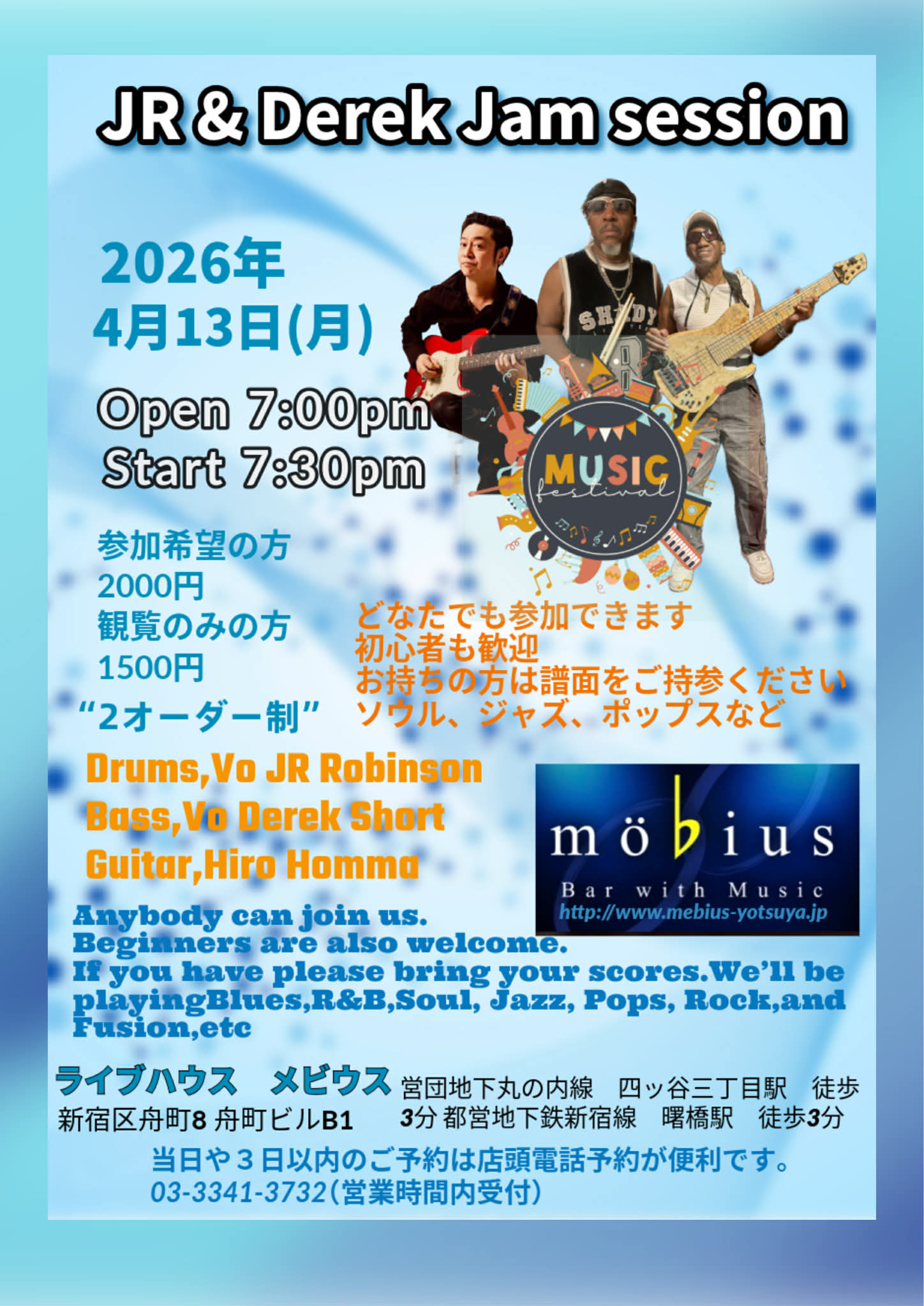 resenting JR&Derek Jam session ソウル、ジャズ、POPS 開催日2026/04/13(月曜日) オープン19:00 スタート19:30 出演者Dr, JR Robinson Ba,Vo ,Derek Short Gt,Hiro Honnma チャージ料参加 2000円 見学 1500円(税別)
