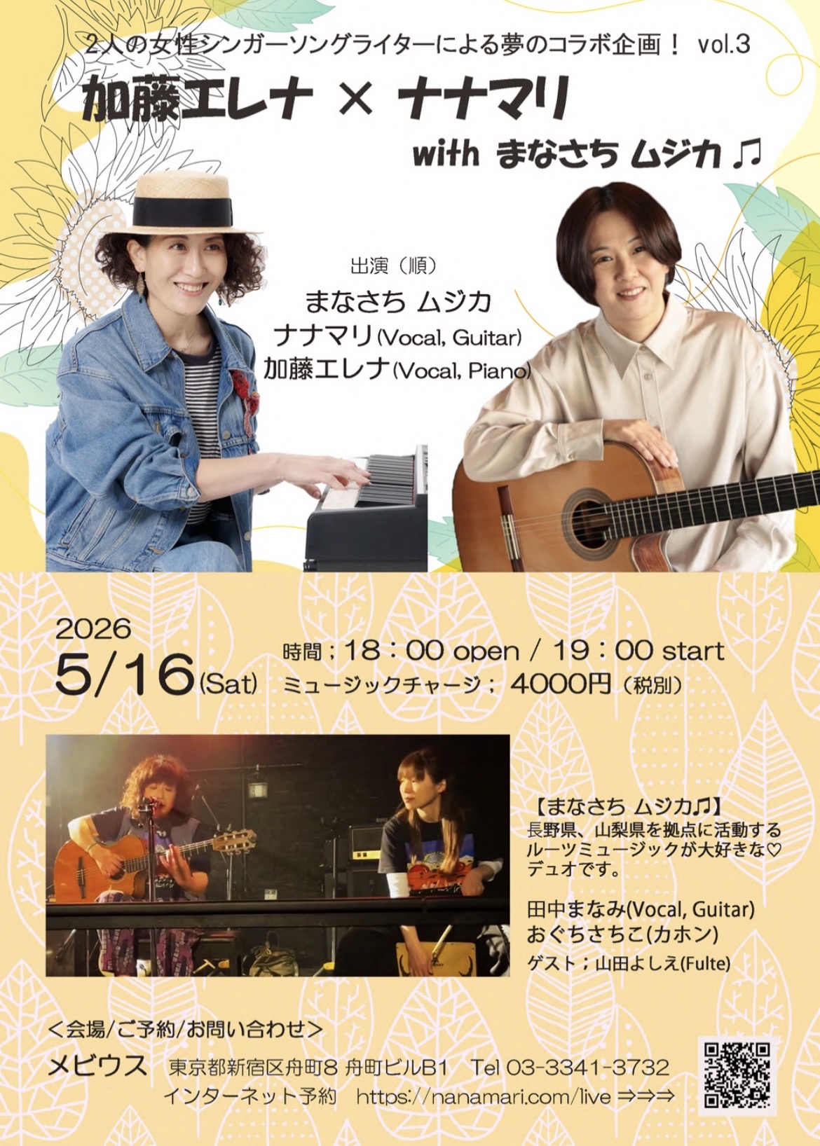 加藤エレナ × ナナマリ with まなさち 開催日2026/05/16(土曜日) オープン18:00 スタート19:00 出演者ナナマリ(Vo,Gt) 加藤 エレナ(Vo,Pf) まなさち ムジカ 田中 まなみ(Vo,Gt) おぐちさちこ(カホン) ゲスト 山田 よしえ(Fl) チャージ料4000円(税別)