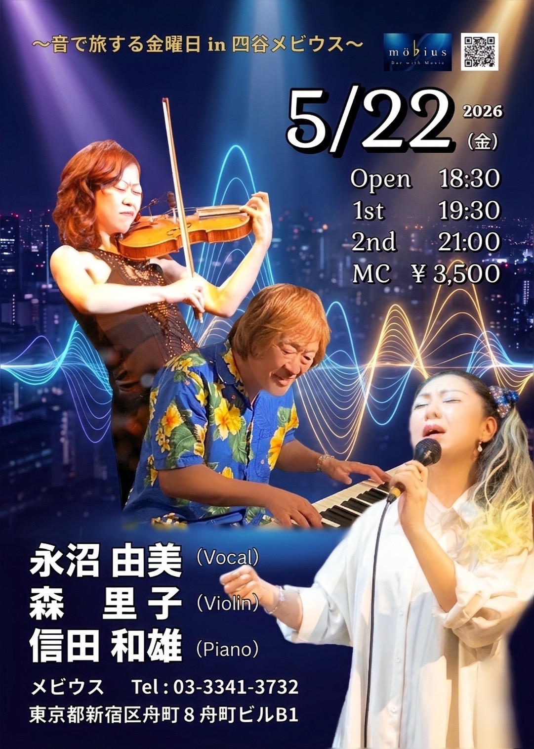 ~音で旅する金曜日in四ッ谷メビウス~ 開催日2026/05/22(金曜日) オープン18:30 スタート19:30 出演者永沼 由美(Vo) 森 里子(Vin) 信田 和雄(Pf) チャージ料 MC 3,500円(税別)
