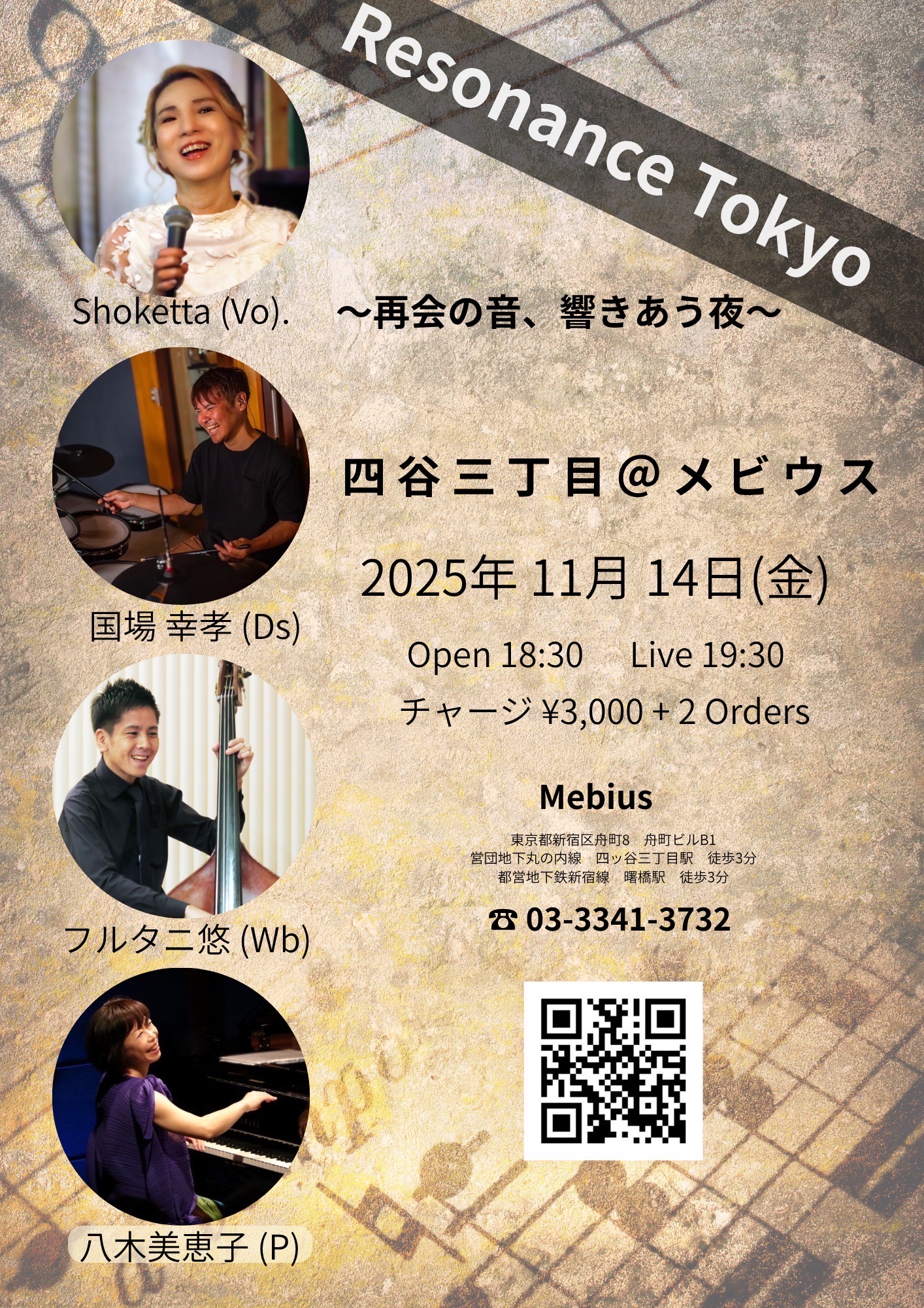 Resonance Tokyo 開催日2025/11/14(金曜日) オープン18:30 スタート19:30 出演者Shoketta(Vo) 匡場 幸孝(Ds) フルタニ 悠(Wb) 八木美恵子(Pf) チャージ料 MC 3,000円(税別)