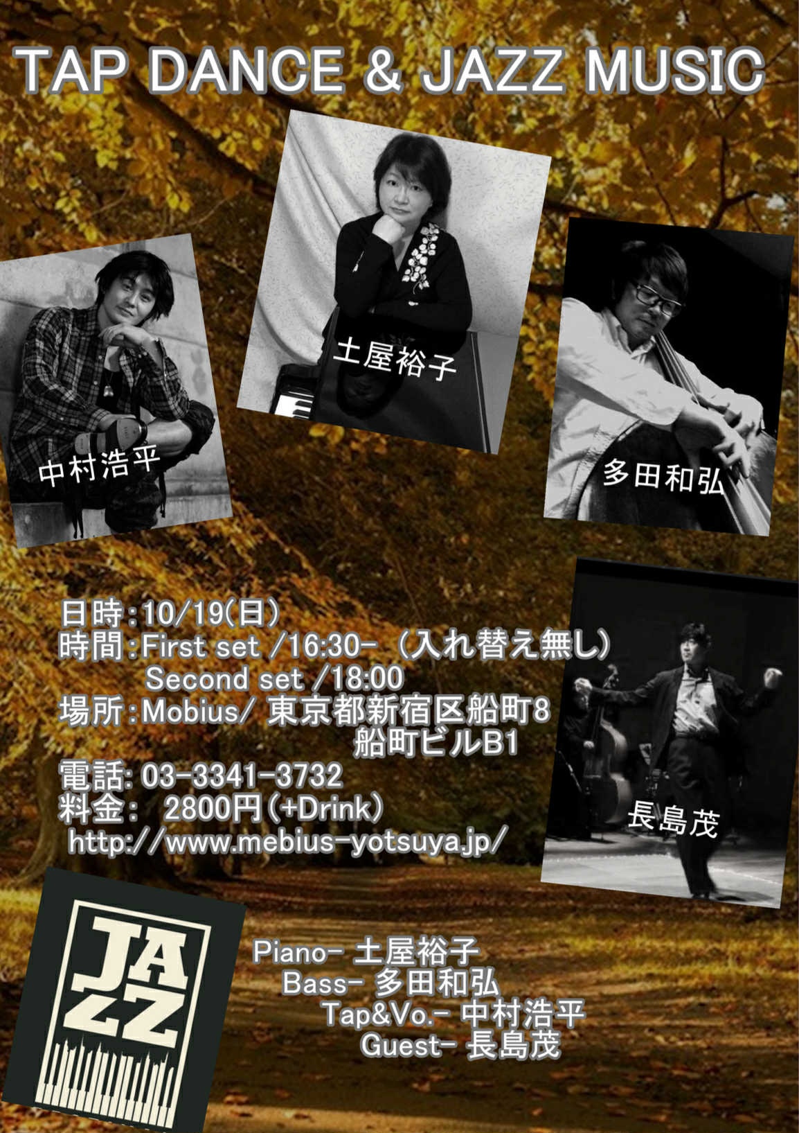 TAP DANCE & JAZZ MUSIC 開催日2025/10/19(日曜日) オープン15:30 スタート16:30 出演者Pf 土屋 裕子 Tap&Vo 中村浩平 Ba 多田 和弘 Guest 長島 茂 チャージ料2800円(税別)